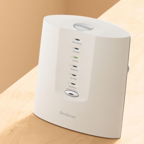 Clinically proven sleep sounds! White noise machines for babies gently lull infants to sleep. With programs developed by Dr. Jeffrey Thompson of the Center for Neuroacoustic Research, Brookstone Tranquil Moments white noise machines for babies are clinically proven baby sleep solutions for parents looking for a little sleep themselves! Wonderfully effective sleep aids, these white noise machines calm restless children...and help them sleep more soundly. Choose soothing white noise or any of five other clinically proven sound programs. Set the 30-, 60- or 90-minute sleep timer and select from Prenatal, Lullaby, Dolphins, Car Ride, Heartbeat, and White Noise programs. Exclusive Sleep Enhancement Techn ology gradually slows down the program and decreases volume to gently lull your child to sleep. Uses AC adapter (included) or four AA batteries (not included). Bring better sleep to the entire family. Put one of our Tranquil Moments white noise machines for babies next to your child\'s crib! Exclusive Sleep Enhancement Technology Sleep Center research has proven that a gradual slowing of sounds promotes better sleep and relaxation. We\'ve taken this research and worked with renowned sound therapist Dr. Jeffrey Thompson to develop our exclusive Sleep Enhancement Technology. Simply press the Sleep Enhancement button, and over the next 20-minute period the therapeutic sound program will gradually slow down to gently lull babies and young children to sleep. Six sounds soothe babies and young children Lullaby: A professionally composed, delightful melody without recognizable repetition. Dolphins: The peaceful ocean surf combined with playful dolphin sounds. Car Ride: The rhythmi c hum of a car without the nuisance of physically driving around the b lock. Heartbeat: The comforting pulse of a mother\'s heartbeat. White Noise: Like the steady flow of a cascading waterfall, this natural sound blocks out disturbing noises and shares many sounds that are heard in the womb.