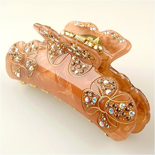 You\'ll be tongue-tied at how easy it is to transform your tresses with this sassy claw clip. Six happy little bows flourished with more than 200 clear and ginger-hued Swarovski crystals are set off by the luminous ginger-hued finish with textured-pattern undertone. With 14 interlocking golden teeth, the Clandestine Golden Amber claw clip is able to secure fine to medium hair into a twist. The rounded teeth and curved contour of jaw provide comfortable solution for holding back all or part of your hair. No more fit-to-be-tied hair dilemmas. . . just twist, clip and be happy. Keep one in your purse for emergencies - or give one to a friend in need!